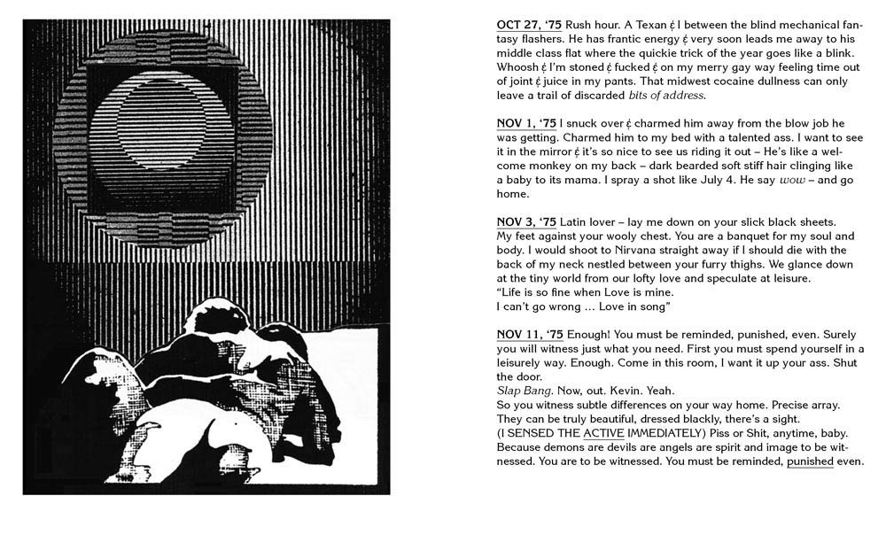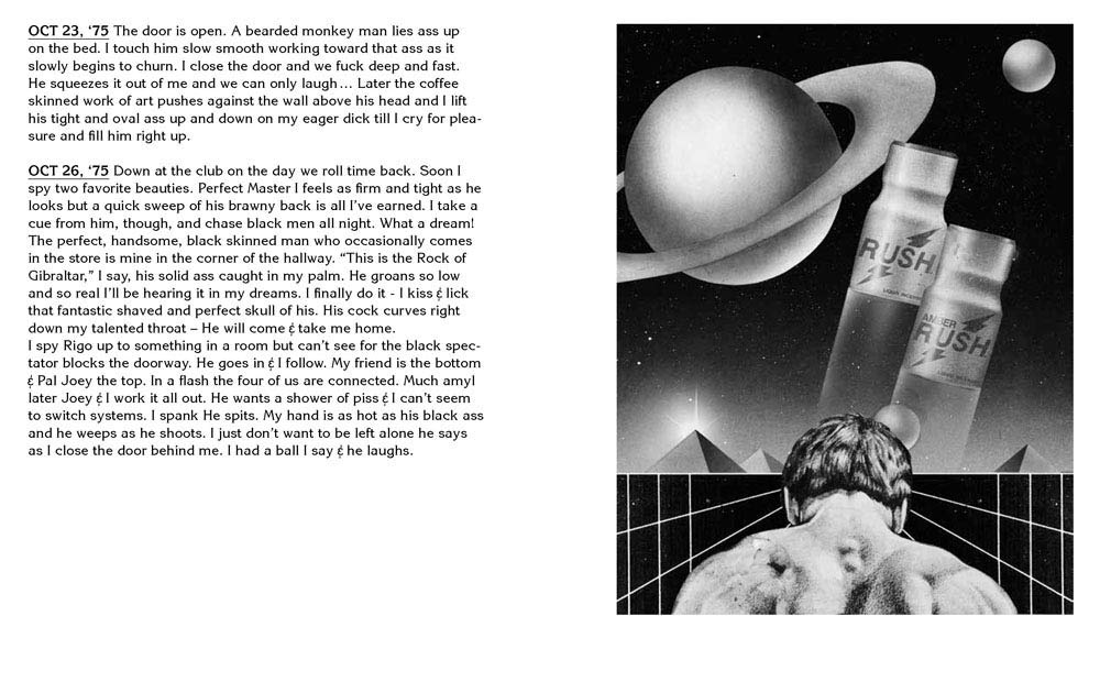 For this book, artist Gwenaël Rattke created 25 original illustrations inspired by selected entries, three street maps documenting locations mentioned herein, and four collages of photos, ephemera and notes that Cowley had inserted in the journal. This book shows a very out-front, alive person going through the throes of gay liberation post-Stonewall.