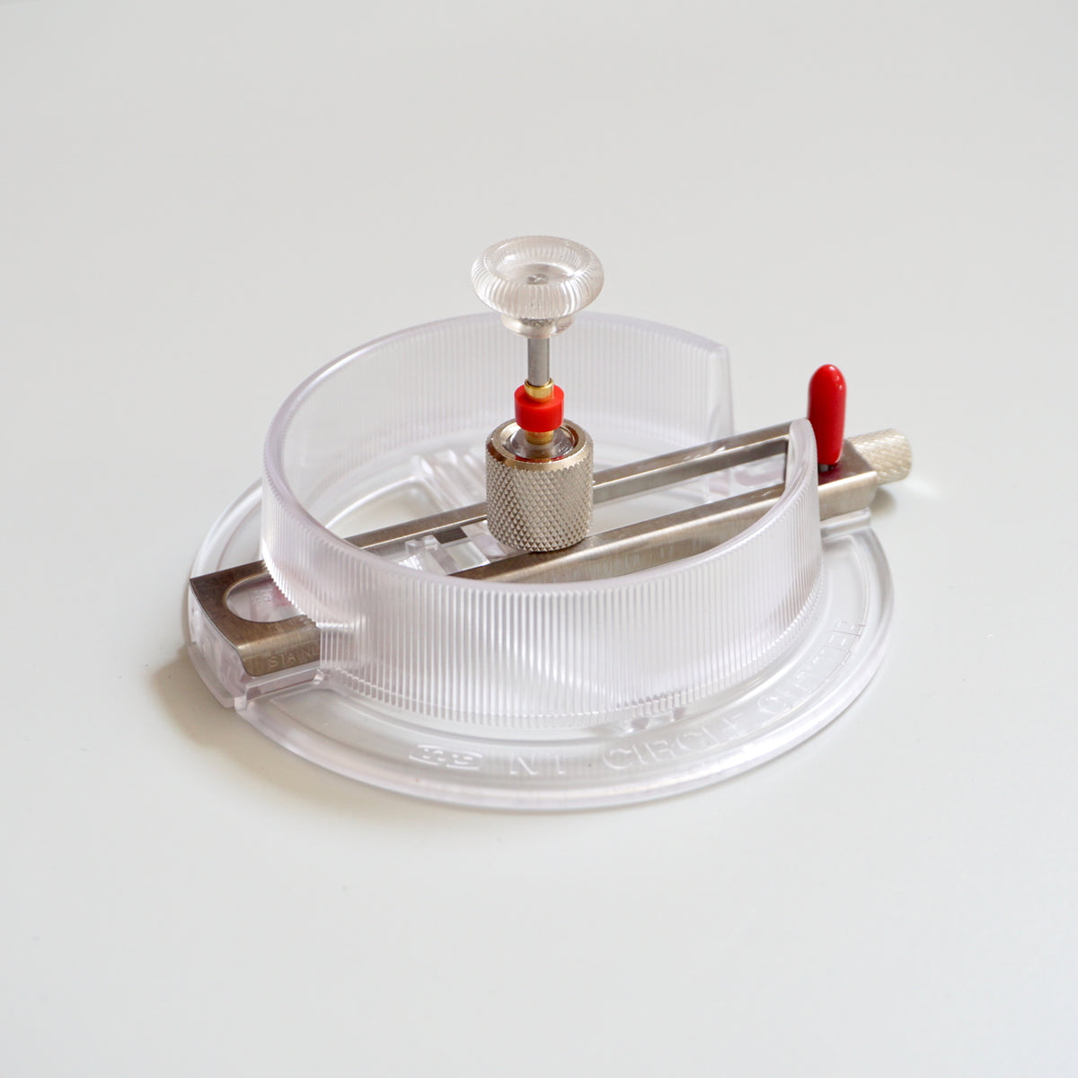 Tool used for accurately cutting circles in thin materials such as paper, thin greyboard, film vinyl, leather, etc without piercing or making a mark. The blades are made from carbon steel.