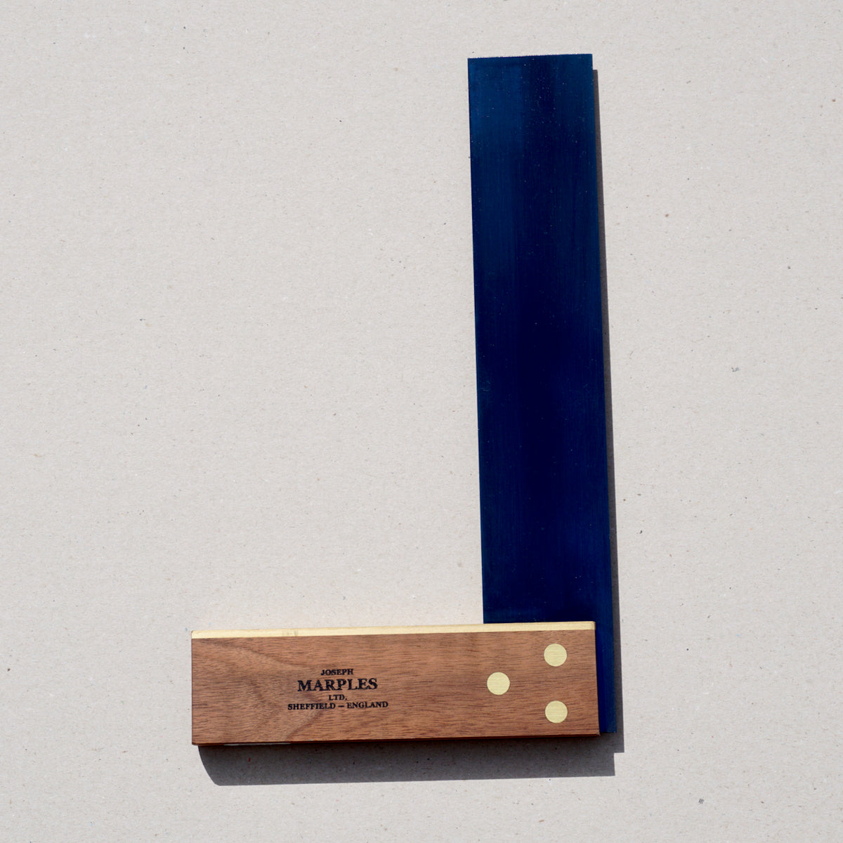 An ‘L’-shaped square set at 90 degrees, used for checking that things are square and marking right angles. Handy for big projects, and for measuring and cutting large sheets of greyboard.