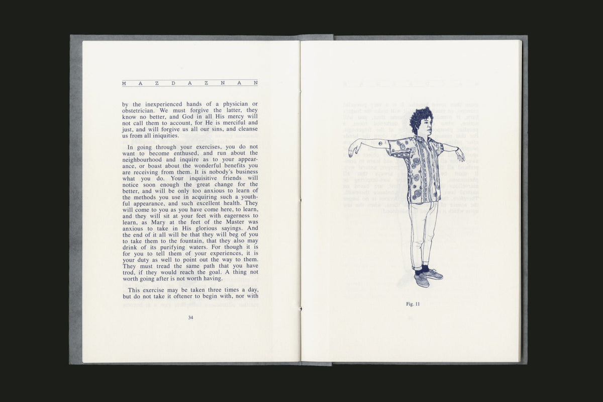 Founded by the extraordinary Dr. Otoman Zar-Adusht Ha’nish in Chicago at the start of the 20th century Mazdaznan was a religion and way of life. Dr. Ha’nish is claimed to have been variously a genius, a shepherd, a typesetter, a magician and a fraud, as well as friend and inspiration to a bewildering variety of figures including Karl Marx, Haeckel, Schopenhauer, Nietzsche, H.G. Wells, Annie Besant and J. H. Kellogg. The Swiss artist and teacher Johannes Itten was a devout Mazdaznan and its exercises were an essential part of his courses at the Bauhaus. Health & Breath Culture has been newly illustrated by Ian Whittlesea with drawings of current Foundation students demonstrating the exercises. It is followed by a selection of found texts and images that go some way to explaining the beliefs and history of Mazdaznan.