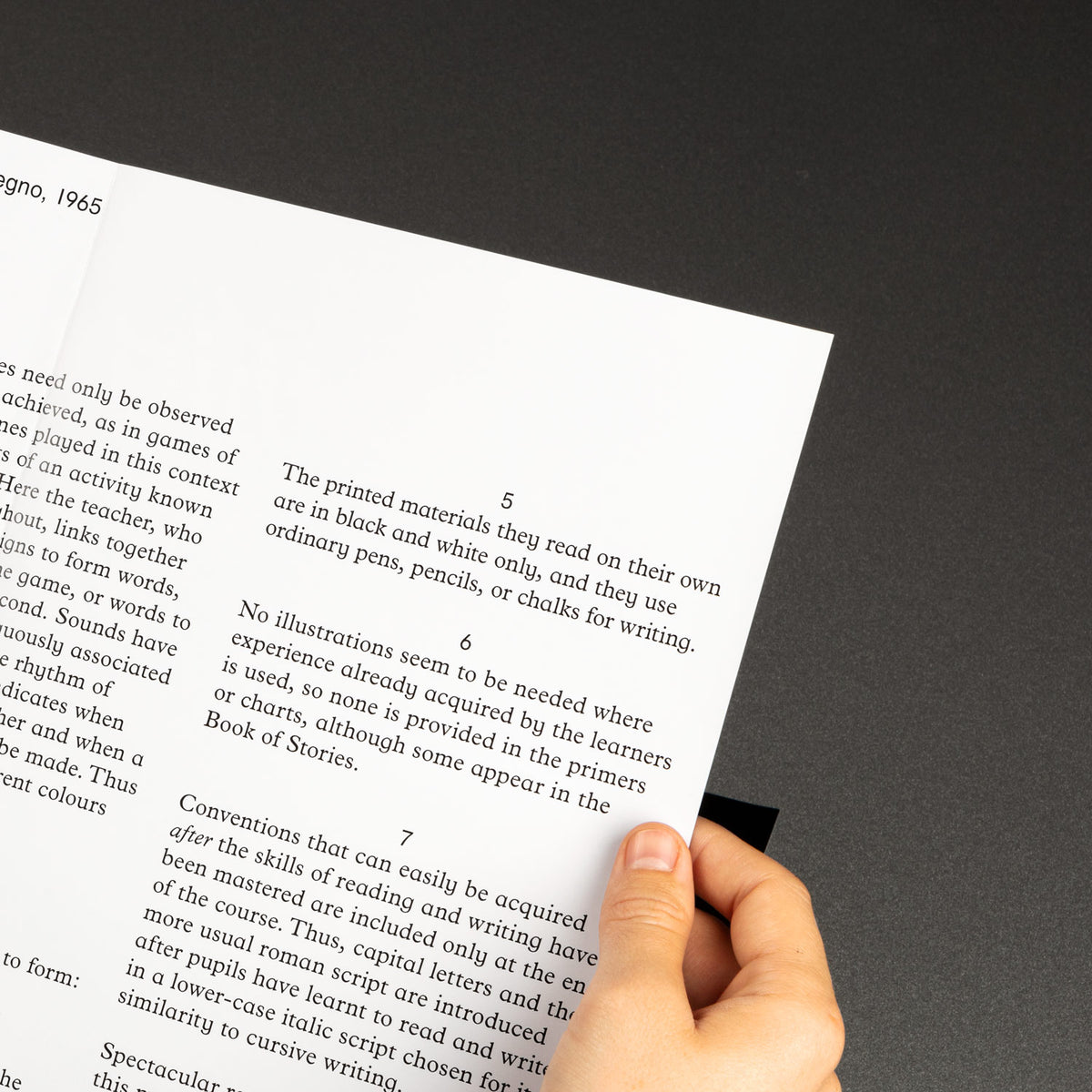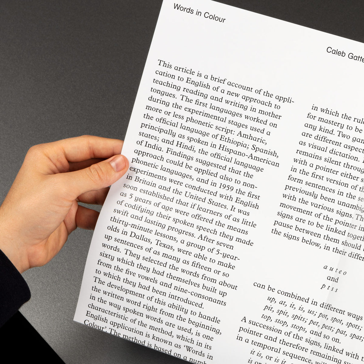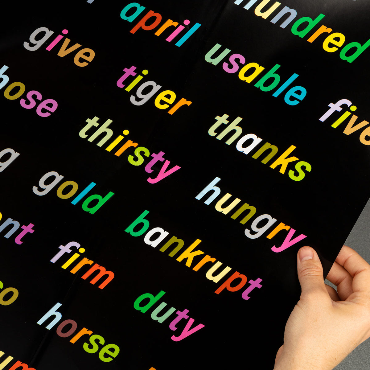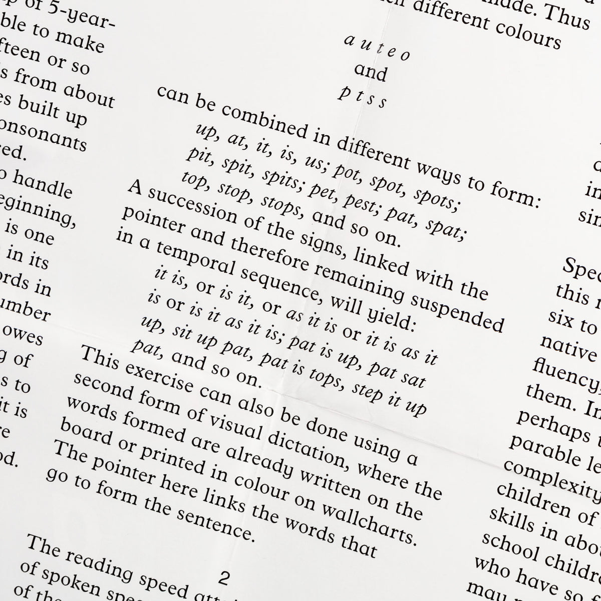 Output 002: Words in Colour is a 1:1 reproduction of Wallchart No.9 by C. Gattegno, published in Penrose Annual 58, 1965 as an illustration to an article outlining new ways of teaching illiterate people to read. The article itself is printed on the back.