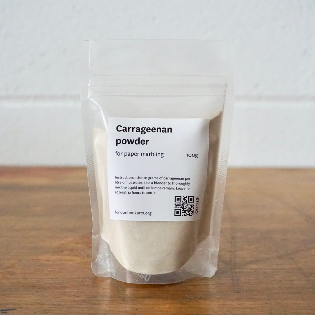 Used to create a thickened water 'size' for paper marbling. Purified, powdered and pre-cooked extract from carrageen moss. Store in a cool, dry place. Instructions for preparation included.
