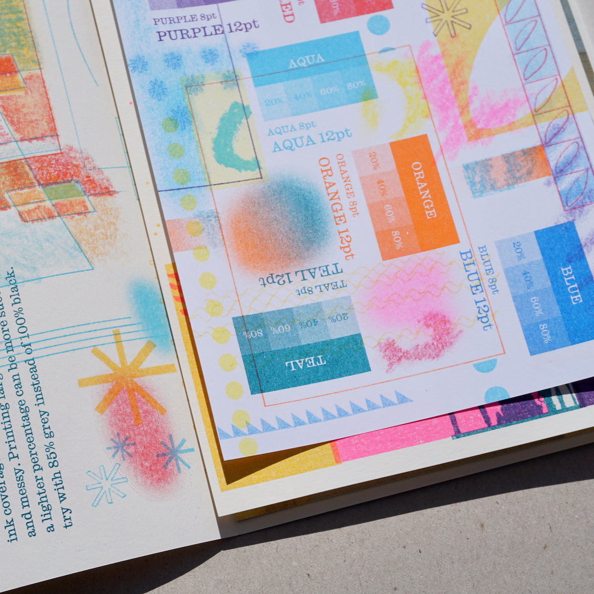 LCBA's guide to Risograph printing designed and illustrated by Esther McManus with inserts by Annie Strachan and Sonnenzimmer (Nick Butcher & Nadine Nakanishi), Anu Ambasna, Arthur Yu, and Aude Mocilnikar.