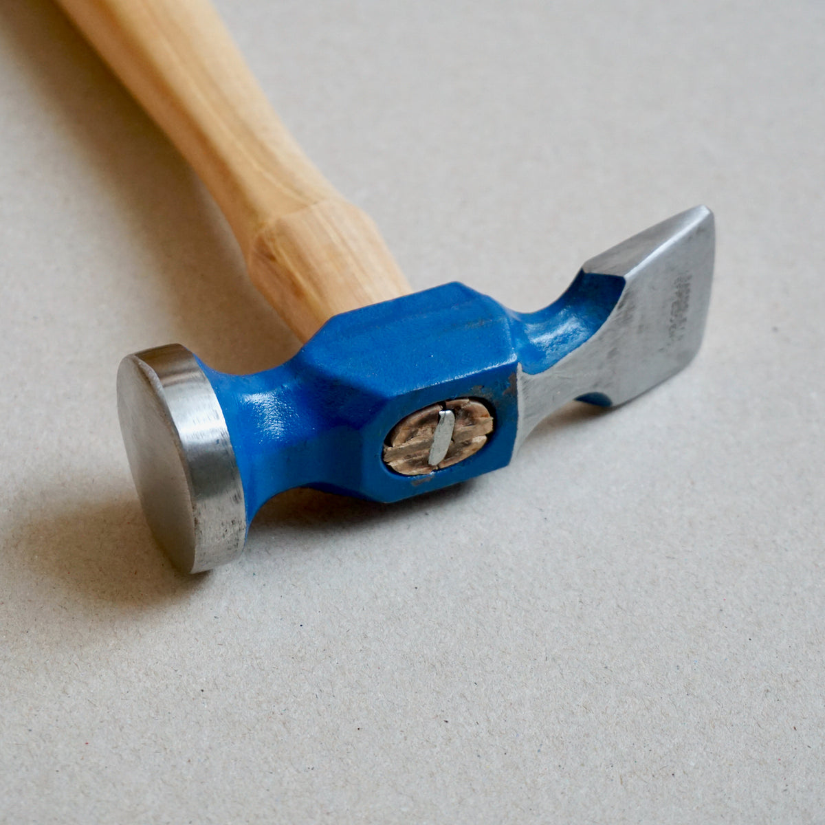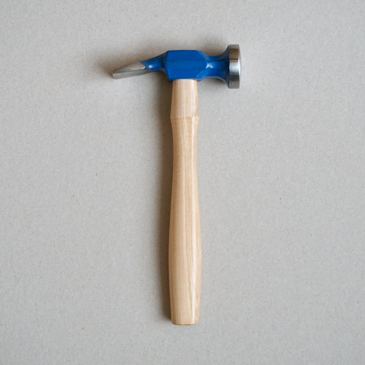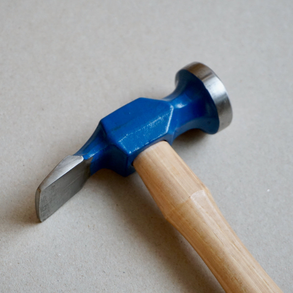 A hammer traditionally used by leather workers and cobblers. The head of the hammer is wide, and smoothly rounded and heavy; ideal for rounding the spine for a Round-back Case Binding.
