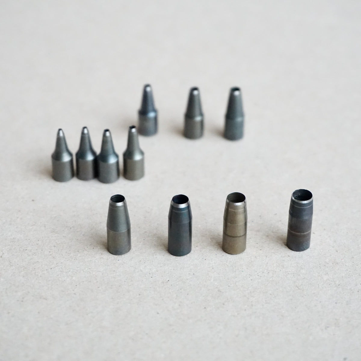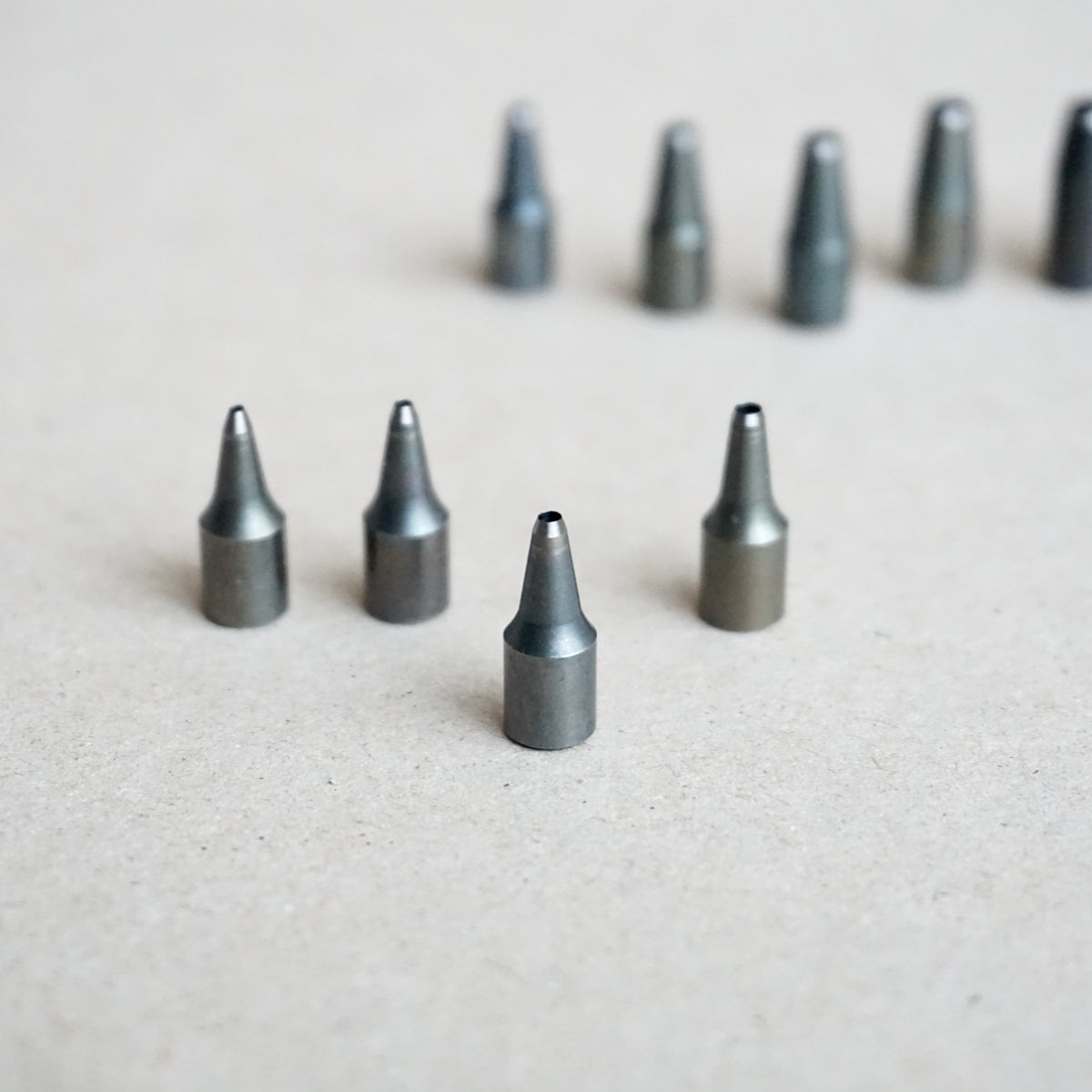 Steel drill bits to be used with Japanese Screw Punch. The Japanese Screw Punch is the perfect tool for making holes in a multitude of materials, including cloth, paper, board and leather. Great for stab bindings, portfolios and fabric covers. Made in Japan (beware of cheap imitations!). The screw punch makes holes quickly and cleanly when pushed into the material to be cut. Lovely smooth action, and best done onto a cutting mat to protect the drill bits.